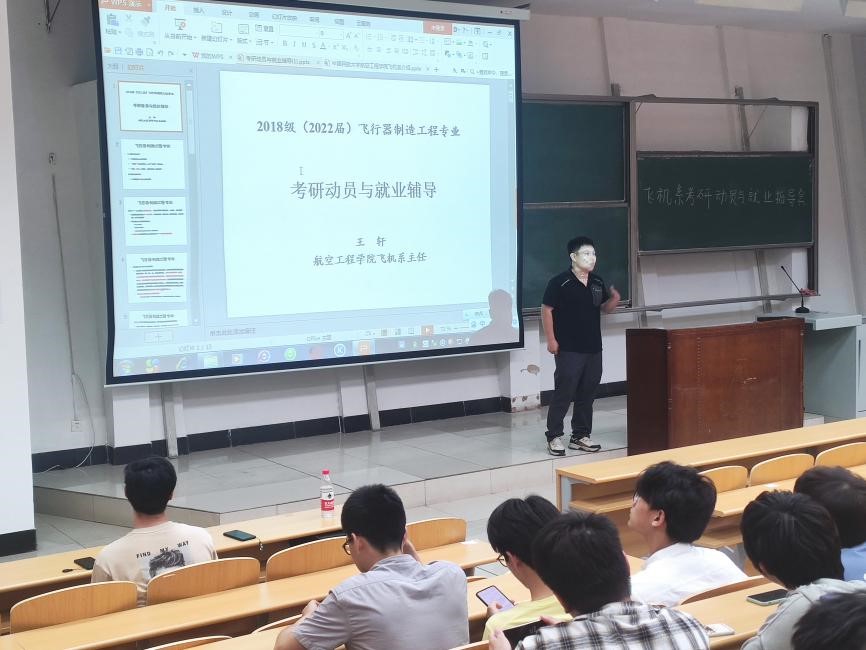 会议由飞机系主任王轩老师主讲。王轩老师首先分析了飞制专业人才培养特点,并与985/211高校同类专业培养体系进行对比,指出了我校飞制专业毕业生的相对优势和不足,极大增强了同学们对本专业的认可。然后结合我国多领域民航强国建设目标、学校“十四五”事业发展规划和2035年远景目标纲要,以及机务维修技术发展趋势,王轩老师系统分析了民航和航空工业未来对人才的需求、考研就业形势、未来发展的不同路径和前景等。王轩老师提供了大量具有参考价值的分析、预测和建议,可为同学们进行考研和就业选择及未来人生规划提供帮助。