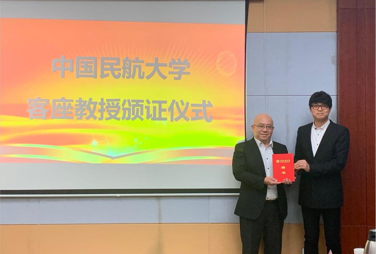 陈健聪教授首先表达了对学校和左书记的感谢,被聘为特聘教授感到非常激动。随后陈健聪教授对自己的经历进行了简短介绍,并表示在今后的合作中一定尽最大努力开展合作交流,在实习、实训、项目合作等方面,为中国民航大学的学生和老师提供便利,在联合实验室的基础上,使得合作更加务实和高效。