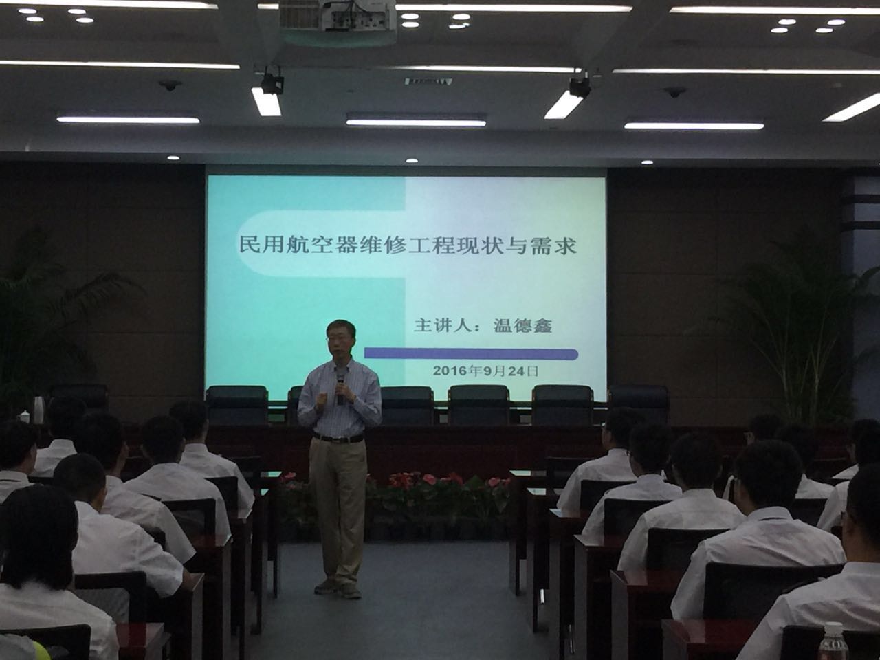 2016年9月24日下午,值中国民航大学65周年校庆之际,著名校友温德鑫来校为航空工程学院学生作了题为“民用航空器维修工程现状与需求”的讲座。2015级航空工程学院部分学生代表参加了此次讲座。