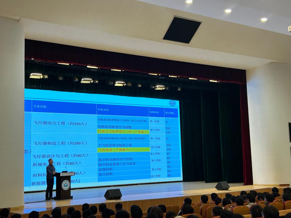 随后,各位专业负责人向学生们详细的介绍了各专业。飞行器动力工程专业的曲春刚老师从飞动专业的历史、面向民用航空发动机领域的特色培养、以专业技术人才培养为主,兼具科技创新、国际化特征的分类卓越、雄厚的师资力量、毕业去向等方面进行了介绍。飞行器制造工程专业和飞行器设计与工程专业的孙斌老师从国内办学情况方面分析了飞设专业的民航特色,面向未来民机前沿培养设计与适航人才培养定位、未来民机制造业与民航运输业需求的培养目标,旨在培养技术与管理复合工程实践能力突出创新型人才。飞行器制造工程专业作为老牌专业,航空特色突出、历史底蕴深厚、办学条件优越、师资力量雄厚,紧跟国家重大发展战略,助力国产大飞机制造发展。材料科学与工程专业的路学成老师以“一代材料、一代飞机”为题,向各位同学介绍了航空先进材料与飞机的发展历程,发展大飞机,材料必需先行,希望各位同学借助航空材料之翼继续展现风采、争奇斗艳。新能源科学与工程专业的丁清苗老师从专业背景、人才需求、专业定位、课程体系、实践创新平台、毕业去向等方面做了全面介绍,并寄语各同学海阔凭鱼跃,天高任鸟飞!