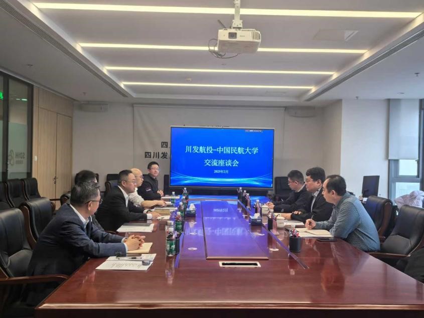 在四川发展航空产业投资有限公司,李杰副总经理和产业管理部、人力资源部及下属企业负责人与学院一行人进行了友好会谈,双方就新质生产力人才联合培养、产学研合作、创新成果转化等进行了深入交流。