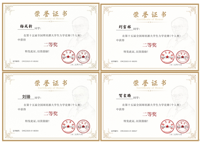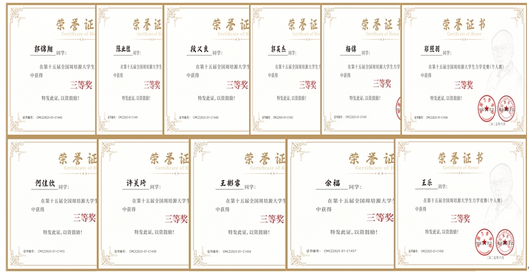 图 全国周培源大学生力学竞赛三等奖部分获奖证书