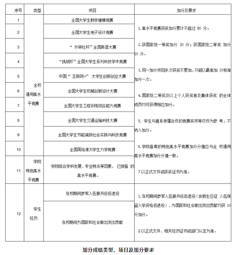 其中,学习成绩= 申请时平均学分绩点/4.8×100(享受特殊招生政策学生认定的课程成绩,需以原始成绩及学分绩点进行计算;学习成绩四舍五入保留至小数点后两位);加分成绩=高水平竞赛加分+学生经历加分。具体加分成绩的类型、项目、加分及要求见表。