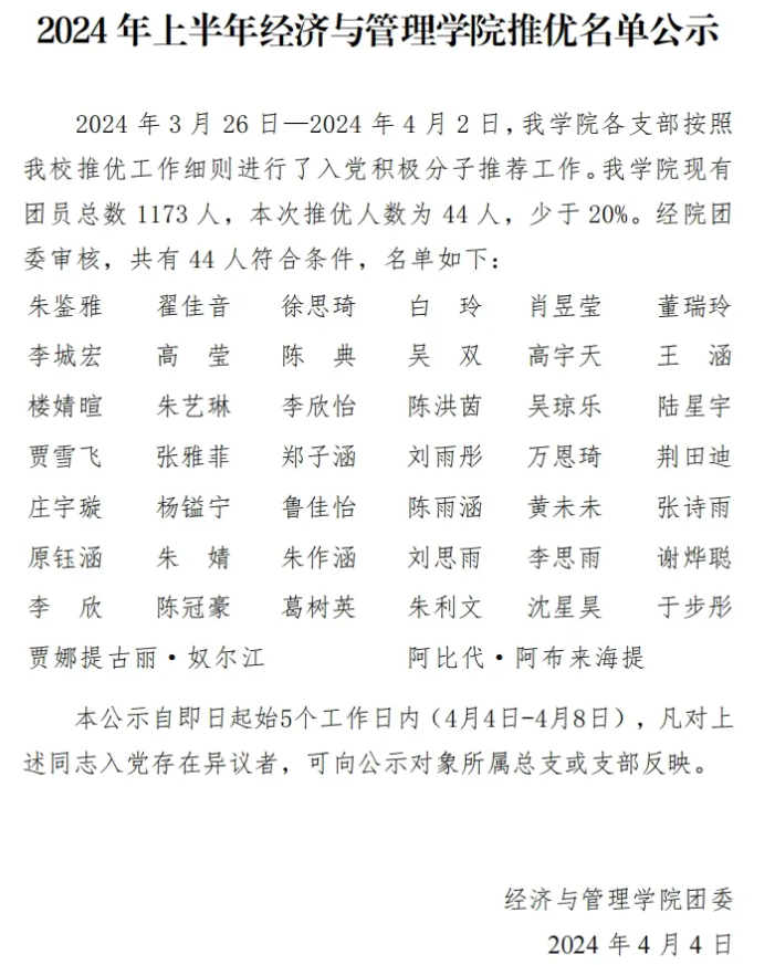 2024年上半年经济与管理学院推优名单公示