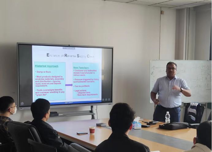 2023年3月22日,Kannan Govindan教授于经济与管理学院分别开展主题为“Introduction to Sustainability and Reverse Logistics”和“Closed Loop Supply Chain and Its Application with Case Study”的讲座,张禹讲师主持,许垒教授和来自各专业的学生与会聆听。讲座过程中,Kannan Govindan教授绘声绘色地讲述了传统供应链至可持续供应链的发展历程,以及发展绿色供应链的驱动因素、阻碍和相关拓展。其中,着重对三重底线(社会、环境和经济)理论进行深入讲解和现场交流,并深入讲述和探讨闭环供应链、数字化和可持续发展目标之间的关系。期间Kannan Govindan教授多次借助现场物品以矿泉水和PPT遥控翻页笔为例讲述闭环供应链、绿色供应链、回收再制造等研究主题在现实生活中的应用以及未来的发展方向。整个讲座过程生动有趣,与会人员形象直观地理解了可持续供应链等理论知识的现实意义,此次讲座激发了同学们的学习兴趣,奠定了同学们对于可持续供应链的基础认识。