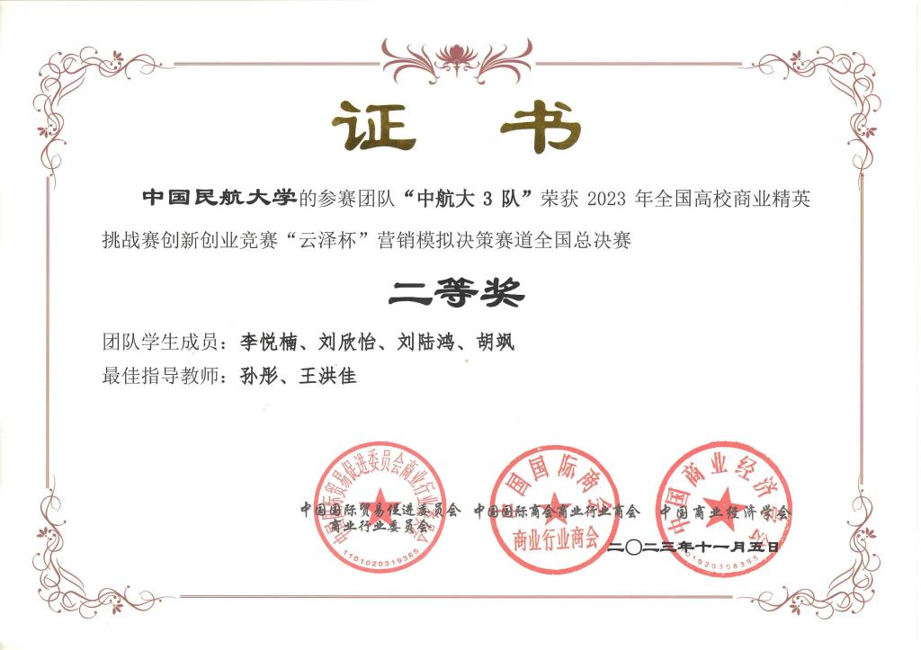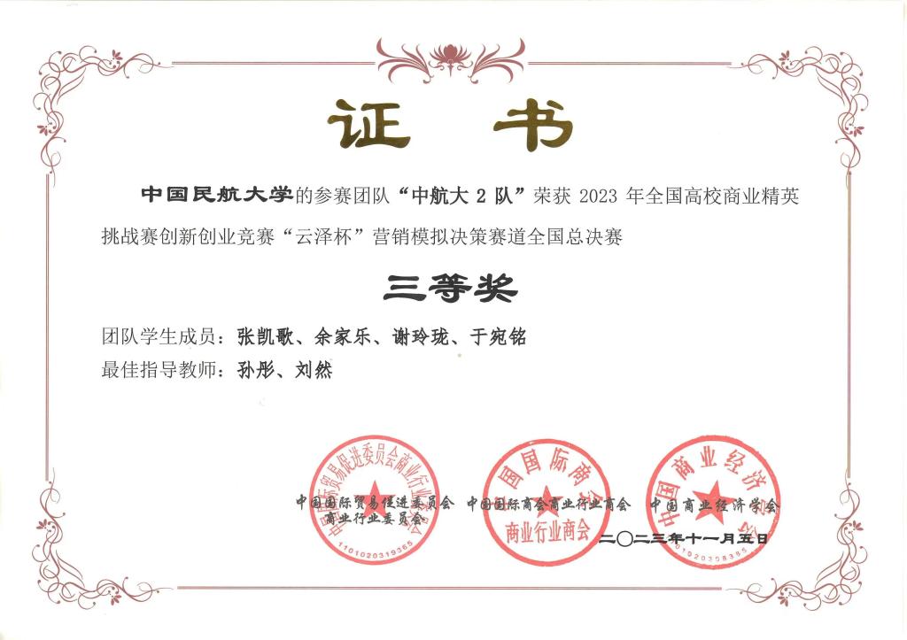 热烈祝贺中国民航大学经济与管理学院3支队伍在2023年全国高校商业精英挑战赛创新创业竞赛全国总决赛中分别斩获“云泽杯”营销模拟赛道全国总决赛一等奖、二等奖、三等奖。