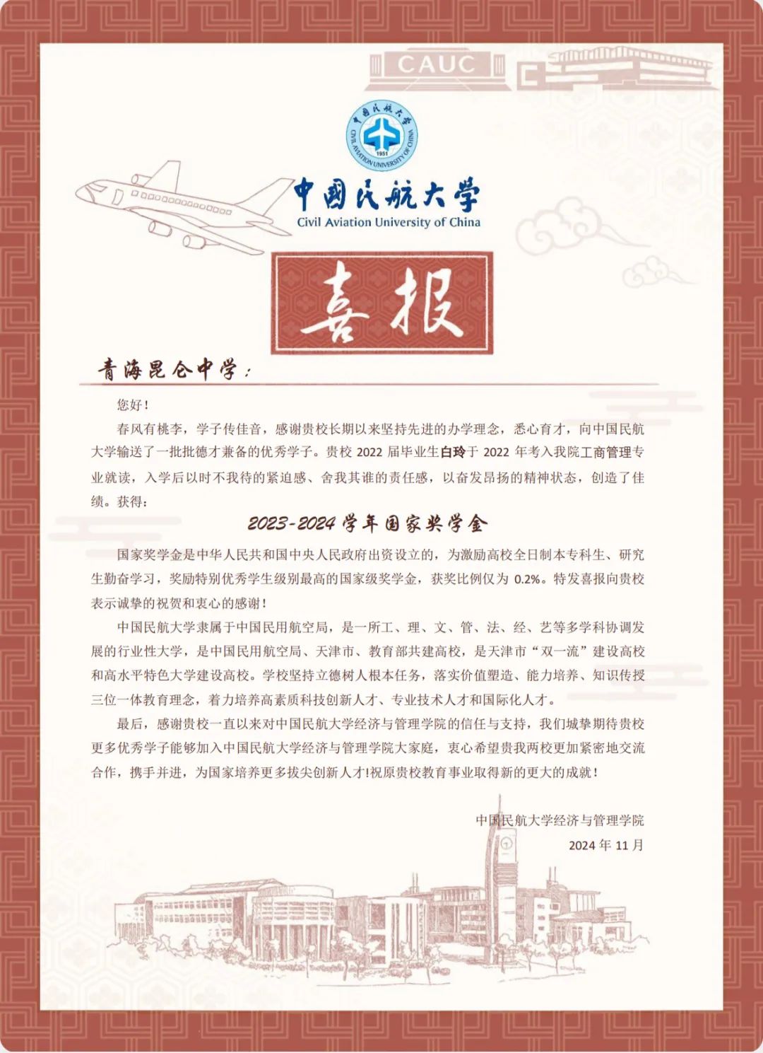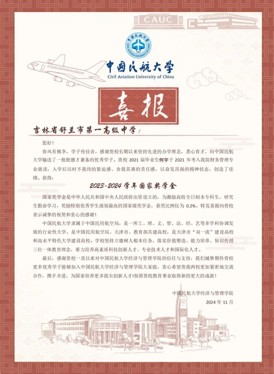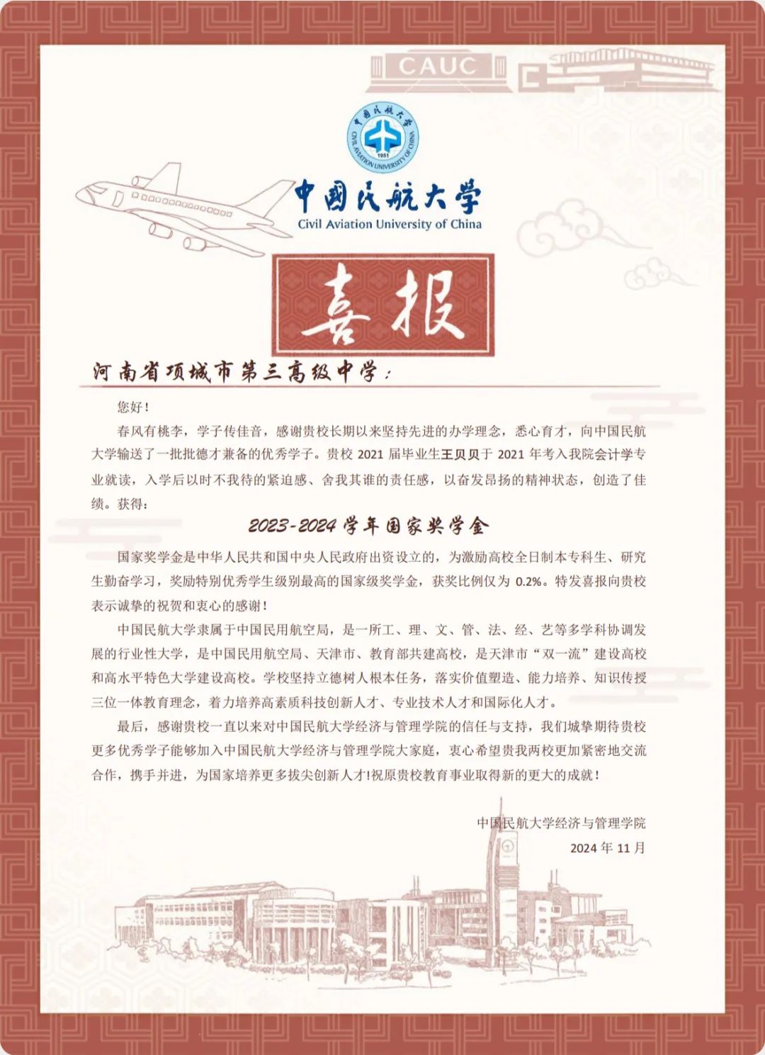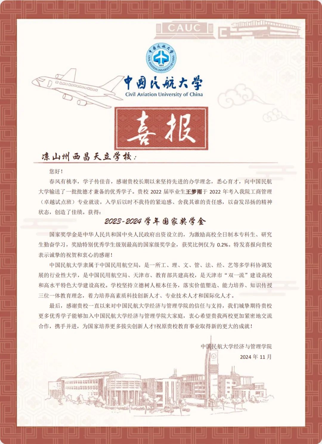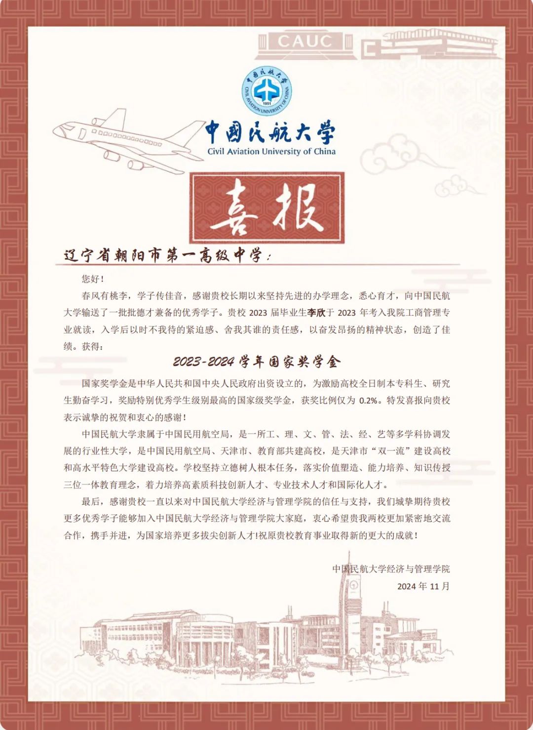 喜报虽小,却蕴含无上荣光。一封封喜报既承载着家庭的教育、学校的栽培、个人的努力,也承载着对家庭和高中母校的真诚问候和对学生成长的由衷喜悦,是学校资助育人成果的全面展现。喜报寄送活动是学校深化资助育人工作、强化家校协同育人的一项有效举措,架起了家校社互通“连心桥”。一直以来,我院坚持落实立德树人根本任务,坚持把资助、育人、服务贯穿始终,积极搭建家校社共育有效平台,探索完善发展型资助工作模式,丰富资助育人工作内涵,切实提升资助育人实效。今后,我院将坚持育人导向,将育人作为资助工作的出发点和落脚点,着力构建同频共振、同向发力、双向奔赴的高质量家校社携手共育长效机制,助力学生成长成才、全面发展。