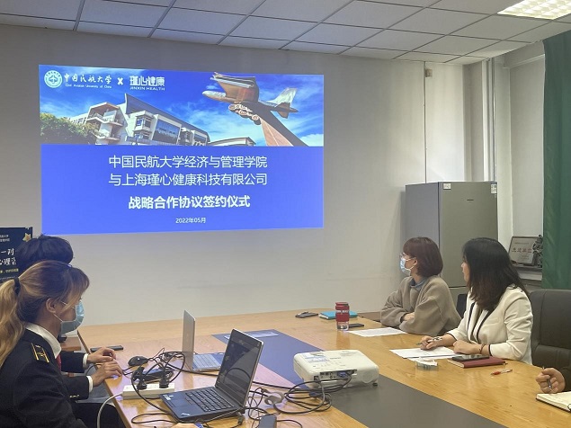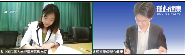 为了更好地守护学生心理健康,近期中国民航大学经济与管理学院与上海瑾心健康科技有限公司(以下简称“瑾心健康”)举行心理健康服务项目战略合作的线上签约仪式。瑾心健康创始人兼CEO韩文豪、合伙人兼市场总监王天鸿及市场部相关同事,经济与管理学院党委副书记夏衍,辅导员宋长进、郭娜、宋文妍,部分心协干事和学生代表出席线上签约仪式。