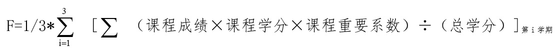 第五条 专业分流采用序贯制方法进行排序,排序依据为学生在校期间操行表现和前三个学期的课业学习成绩。其中,学生在校期间操行表现主要考察学生在校期间校级及以上违纪情况,课业学习成绩是学生综合素质测评评分体系中的课业学习定量计算成绩(简称F),计算方法如下: