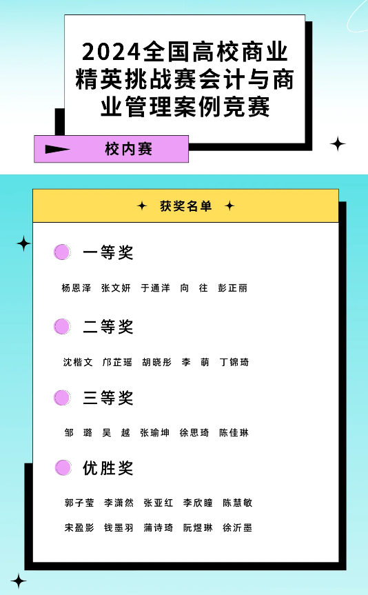 经评选,2024年全国高校商业精英挑战赛会计与商业管理案例竞赛校内赛中多名同学脱颖而出,在此公示获奖同学名单,以资鼓励和表彰。