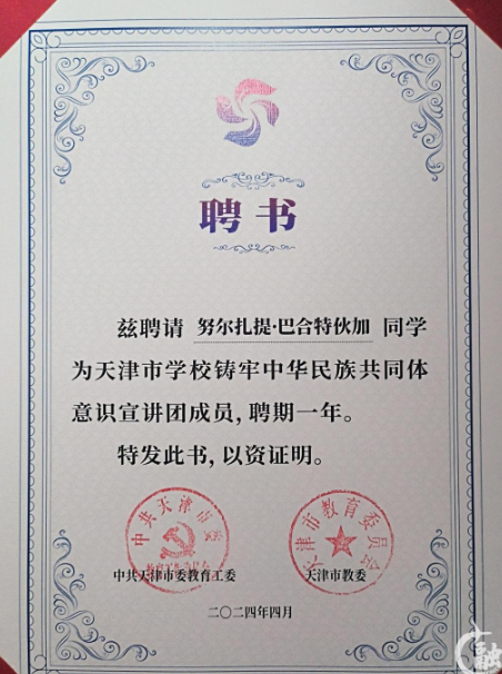 近日,市教育两委、市少民室联合公布天津市学校铸牢中华民族共同体意识宣讲团成员名单,中国民航大学经济与管理学院工商管理专业2021级学生、来自新疆的哈萨克族的努尔扎提·巴合特伙加,从全市41所院校113名优秀少数民族学生候选人中脱颖而出,成功入选由11人组成的宣讲团。