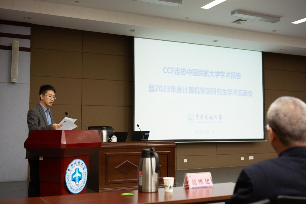 近日,由中国计算机学会(CCF)主办,CCF天津、中国民航大学承办的CCF走进高校活动在中国民航大学学术交流中心成功举办。参加本次活动的嘉宾有中国民航大学党委常委、科创院党委书记葛维建,中国人工智能学会机器学习专委会主任、江苏省人工智能学会理事长南京航空航天大学陈松灿教授,国家杰出青年科学基金获得者西北工业大学郭斌教授,国家级青年人才南开大学杨巨峰教授等。本次活动由中国民航大学计算机学院院长李海丰主持。我校计算机学院、电子信息与自动化、安全学院120余位教师和研究生参加了本次活动。