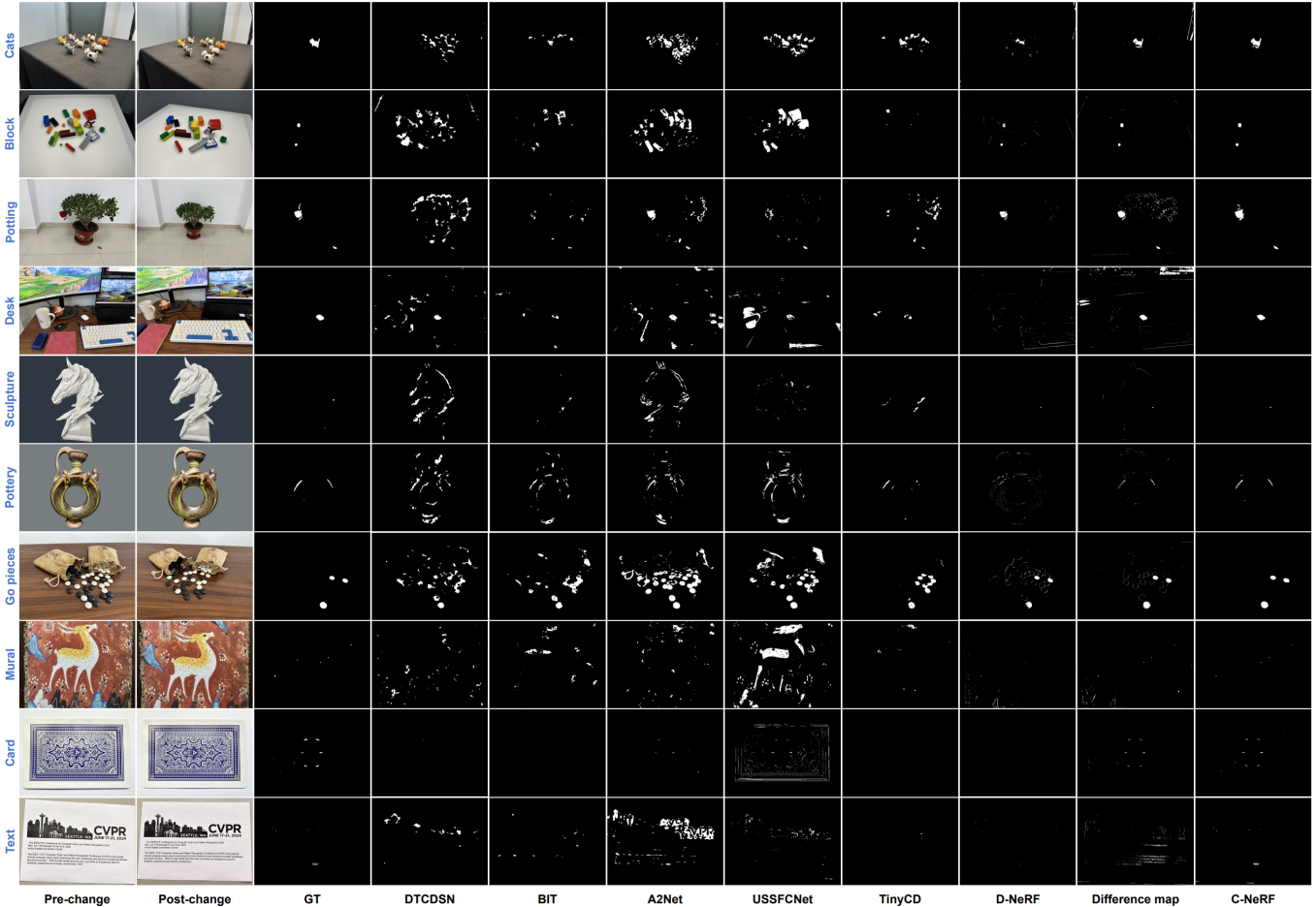本研究的主要贡献包括:突破传统二维方法的视角限制,首次将变化检测任务从二维提升到三维,实现“任意视角变化预测”,解决了遮挡导致的变化遗漏问题;发现“真实变化点在不同视角下具有相似变化特征,虚假变化点则无此特性”的规律;基于此提出“方向一致性约束”,能有效识别实例级、细粒度的场景变化,降低误检率;为验证方法的有效性,构建了全新的场景变化检测数据集,涵盖10个场景、多种场景类型及不同的变化物体,并通过与一系列基准方法对比,充分证明C-NERF的优越性。不同变化检测方法在不同场景下的典型细粒度变化检测结果如图2所示。