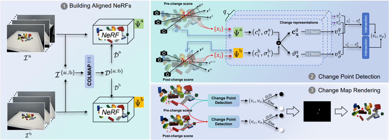 变化检测(Change detection, CD)旨在识别场景中发生改变的区域或物体,其在遥感监控以及机器人导航等领域具有多种应用。以往研究主要基于相机在两个时间戳拍摄的空间对齐图像对来检测场景变化。尽管这类二维方法已取得显著进展,但仍存在两个固有局限性,因此亟需开发三维变化检测方法。一是视角单一,存在遮挡盲区:二维变化检测仅能识别单一视角方向下的变化,无法发现因遮挡而隐藏在其他物体后的变化区域;二是缺乏三维信息,应用受限:该类方法无法获取变化物体的三维形状,这极大地限制了其在需要三维信息的场景中的应用潜力。如图1,本文旨在检测由神经辐射场(Neural Radiance Fields, NeRFs)所表示场景中物体变化引发的场景变化。
