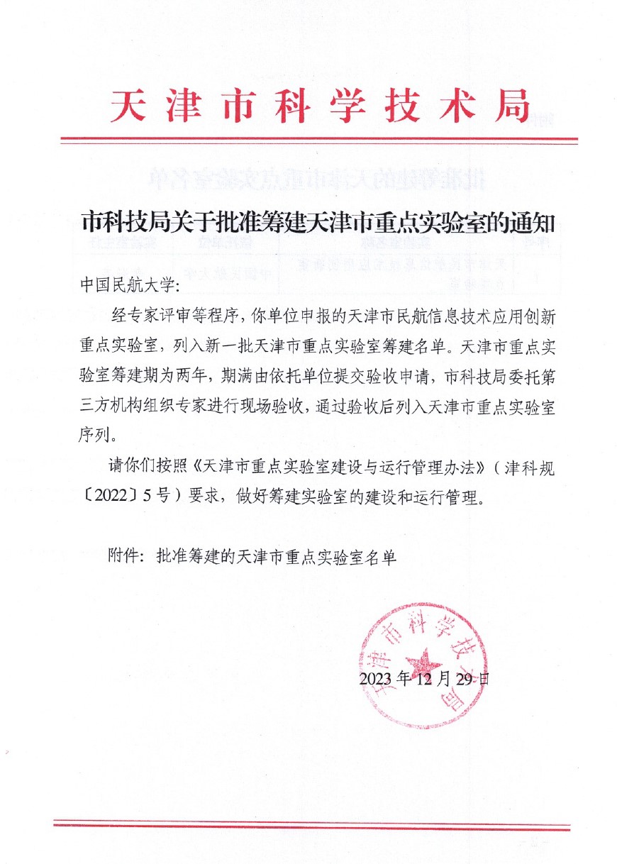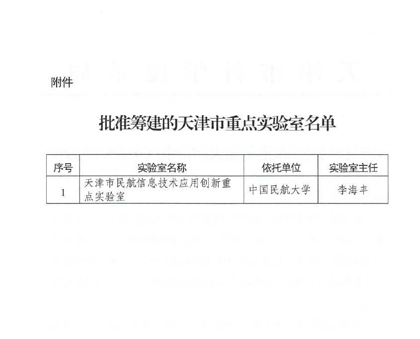 近日,由中国民航大学计算机科学与技术学院牵头申报的天津市民航信息技术应用创新重点实验室成功获批天津市重点实验室筹建资格。列入新一批天津市重点实验室筹建名单后,筹建期为两年,期满由市科技局委托第三方机构组织专家现场验收,验收通过后列入天津市重点实验室序列。