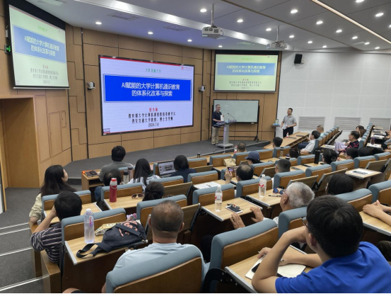 2024年7月6日,一场聚焦于人工智能(AI)在高等教育领域应用的学术盛宴在我校北教14-S125沉浸教室精彩上演。国家级教学名师、中国工程教育认证资深专家、教育部高等学校大学计算机课程教学指导委员会秘书长、教学信息化与教学方法创新指导委员会委员、全国高等院校计算机基础教育研究会副会长、西安交通大学领军学者桂小林教授莅临我校,倾情演绎了一场题为“AI赋能的大学计算机通识教育的体系化改革与探索”的专题报告。此次公开课作为计算机学院AI赋能“教与学”系列的首秀,吸引了计算机学院全体教师及学生代表逾百人到场聆听,共同探索AI技术如何重塑教育未来。
