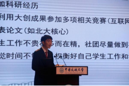 2016级校友王泽霖在会上作分享并寄语学弟学妹,希望大家能够胸怀家国、志存高远;珍惜时光、勤奋学习;勇于挑战,不畏困难;提前制定自己的职业规划,为国家的发展贡献力量。
