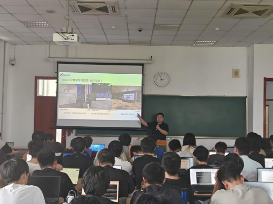 在实战赋能环节,天津昇腾生态创新中心技术专家王泽盛带领师生分组完成了基于昇腾开发者套件和基于智算中心云资源的本地实践。实训现场互动热烈,与会学生表示,亲手在昇腾硬件上跑通模型推理,让我们对国产AI芯片的易用性和性能有了直观认知,也为后续科研项目提供了新思路。
