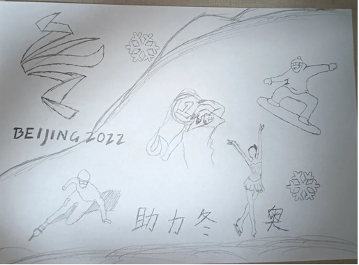 巩怡佳同学绘制的“助力冬奥”生动形象,画面中包含多种运动项目,如花样滑冰、短道速滑等,助力中国健儿再创佳绩!