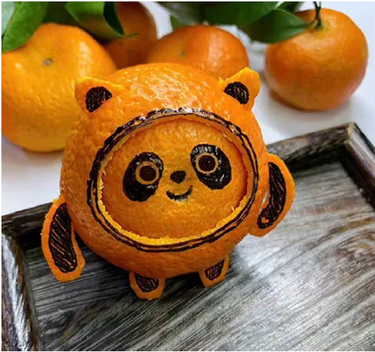 韩嘉辉同学用橘子制作的“冰墩墩”颇具创意,鲜明的橘黄色调点缀着些许黑色线条,展现出一个生动别致的“橘”墩墩,高度还原了冰墩墩活泼、可爱的形象。让我们为他的创意点赞!