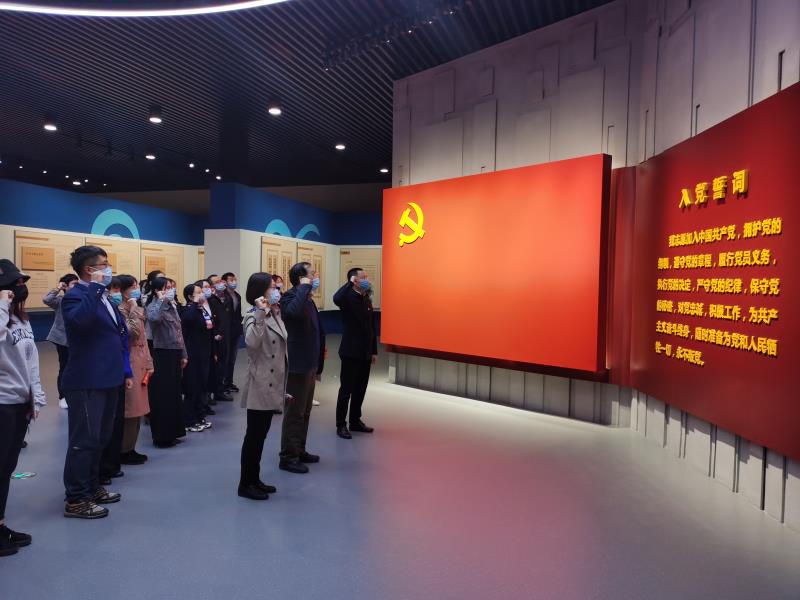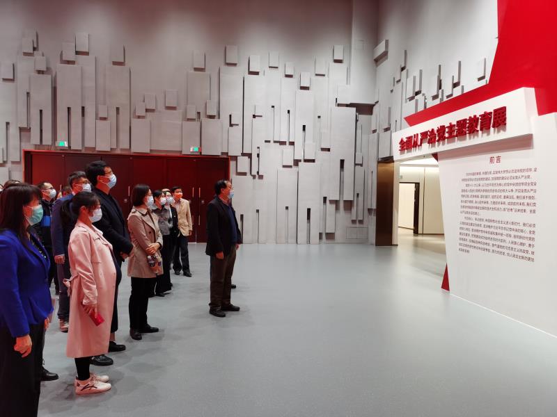 该展览以习近平新时代中国特色社会主义思想为指导,以党的政治建设为统领,以“全面从严治党永远在路上”为主题,依次设立“序厅、政治立魂篇、严管立威篇、纪法立行篇、警示立戒篇、党性立心篇、文化立信篇、互动区和尾厅九个部分,每个部分通过雕塑、图片、视频、触摸屏、实物展览等多种形式,集中展示了党的十八大以来,以习近平同志为核心的党中央以永远在路上的坚韧和执着推进全面从严治党取得的卓著成效。展览还将违法违纪的典型人物、案例,以故事墙的形式声情并茂地展现在观众面前,以强烈的感官体验警醒着党员干部——“不能腐的笼子越扎越牢,不想腐的堤坝正在构建”。在讲解员的悉心讲解下,丁建立院长和乔健丽副书记带领大家详细参观了六大展厅九个部分,并与全体党员在尾厅重温了入党誓词。