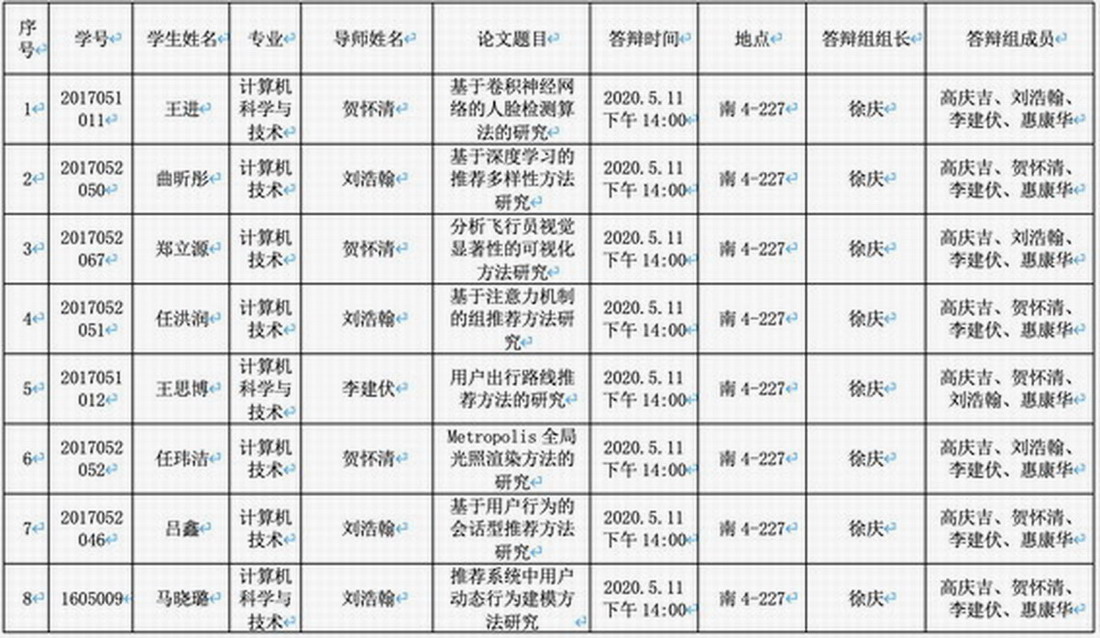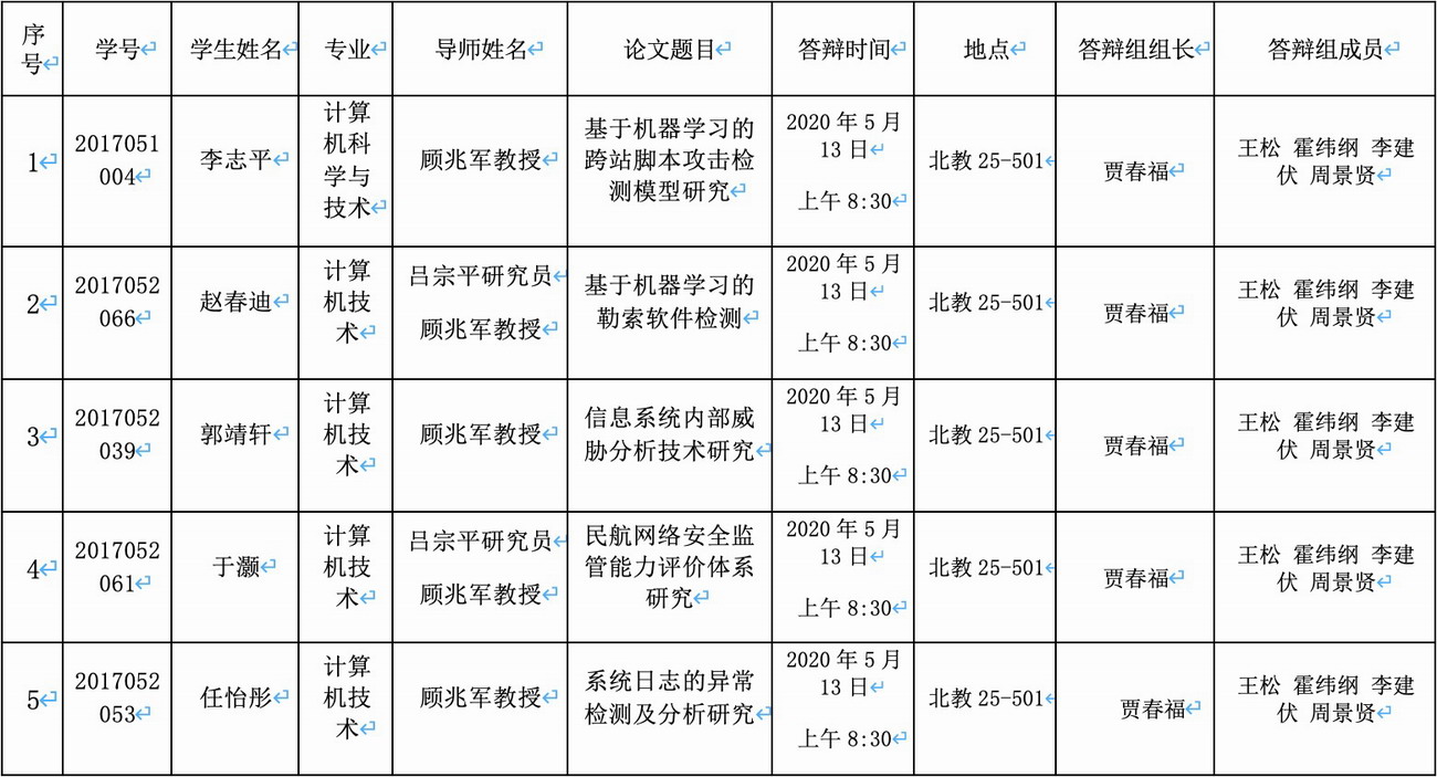 中国民航大学计算机科学与技术学院2020届研究生毕业答辩公告(一)