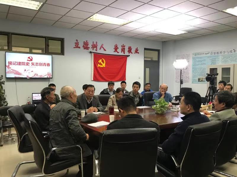 为深入贯彻全国教育大会精神,学习老党员爱岗敬业、无私奉献的事迹,弘扬优良师德师风,加强年轻党员理想理念教育,2018年11月2日上午9点,计算机学院三个教工党支部联动联学主题党日活动“铭记建院史、矢志创青春”在南教四222会议室顺利进行。三个支部的全体党员、应邀的朱家骏、冯增才两位退休老教师参加了此次活动。