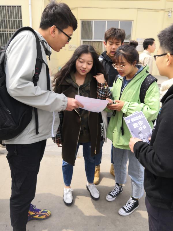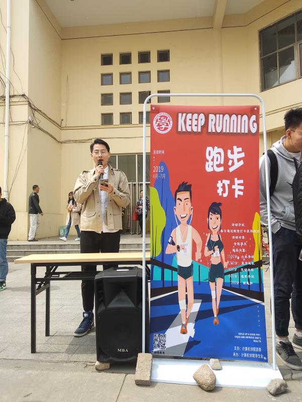 为了全面提升学生身体素质,培养学生运动兴趣,积极推进“三走”活动。计算机学院“keep Runing”跑步打卡活动在计算机学院学生会微信平台宣传一周后,于2019年4月12日中午,在南院综合食堂门口开展了现场宣传活动,正式面向全校师生开启活动报名通知。