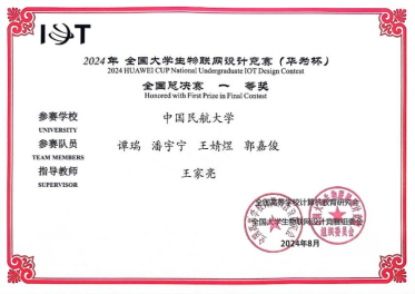 8月16-17日在北京工业大学举办的2024年全国大学生物联网设计竞赛(华为杯)华北分赛区决赛,共有73支队伍参加。经过答辩和演示两个环节的评审,共角逐出华北分赛区一等奖34个,二等奖22个,一等奖获奖团队中32支队伍被推荐入围全国决赛。其中,我院王家亮老师指导的谭瑞(队长,计算机学院)、潘宇宁(计算机学院)、王婧煜(安全学院)、郭嘉俊(计算机学院)同学组成的“奥坎姆剃刀”队伍荣获华北赛区一等奖,并成功晋级全国决赛。