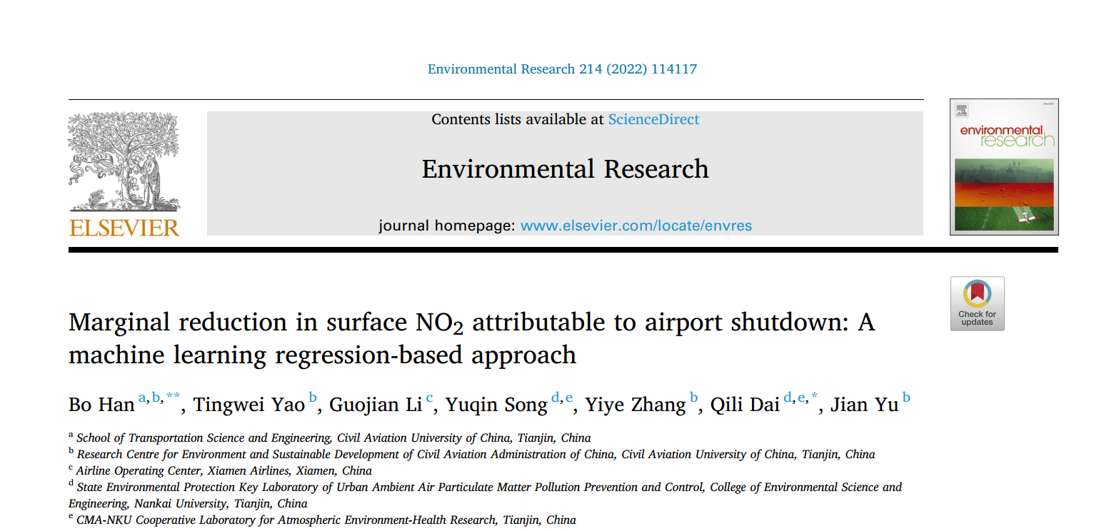 近日,由我院民航低碳与污染防控研究团队主要成员撰写的学术论文“Marginal reduction in surface NO2 attributable to airport shutdown: A machine learning regression-based approach”,发表于国际知名期刊《Environmental Research》第214卷。该期刊为JCR Q1分区,2021年影响因子为8.431,论文第一作者为团队负责人韩博副教授。