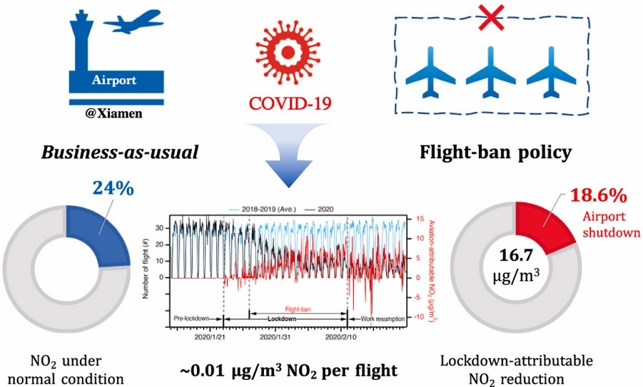 在研究中,该团队利用2018年至2022年厦门机场飞行活动信息和周边临近的一个空气质量监测站的数据,以NO2为代表,评估了机场排放对附近的空气质量的影响。结果显示,整个城市封锁期的空气NO2浓度大约减少了16.7μg/m3,相比正常水平降低了约73%。其中,机场禁飞后航空活动的减少导致NO2浓度降低了约3.1μg/m3,占这次疫情封闭期间NO2下降量的18.6%。同时研究表明,在正常情况下机场相关排放物对当地环境NO2的贡献率高达24%。研究结果证实了机场的飞行活动是重要的大气污染排放源,未来应是我国交通环境治理领域的重点之一。本研究获得了国家自然科学基金重点项目等资助。