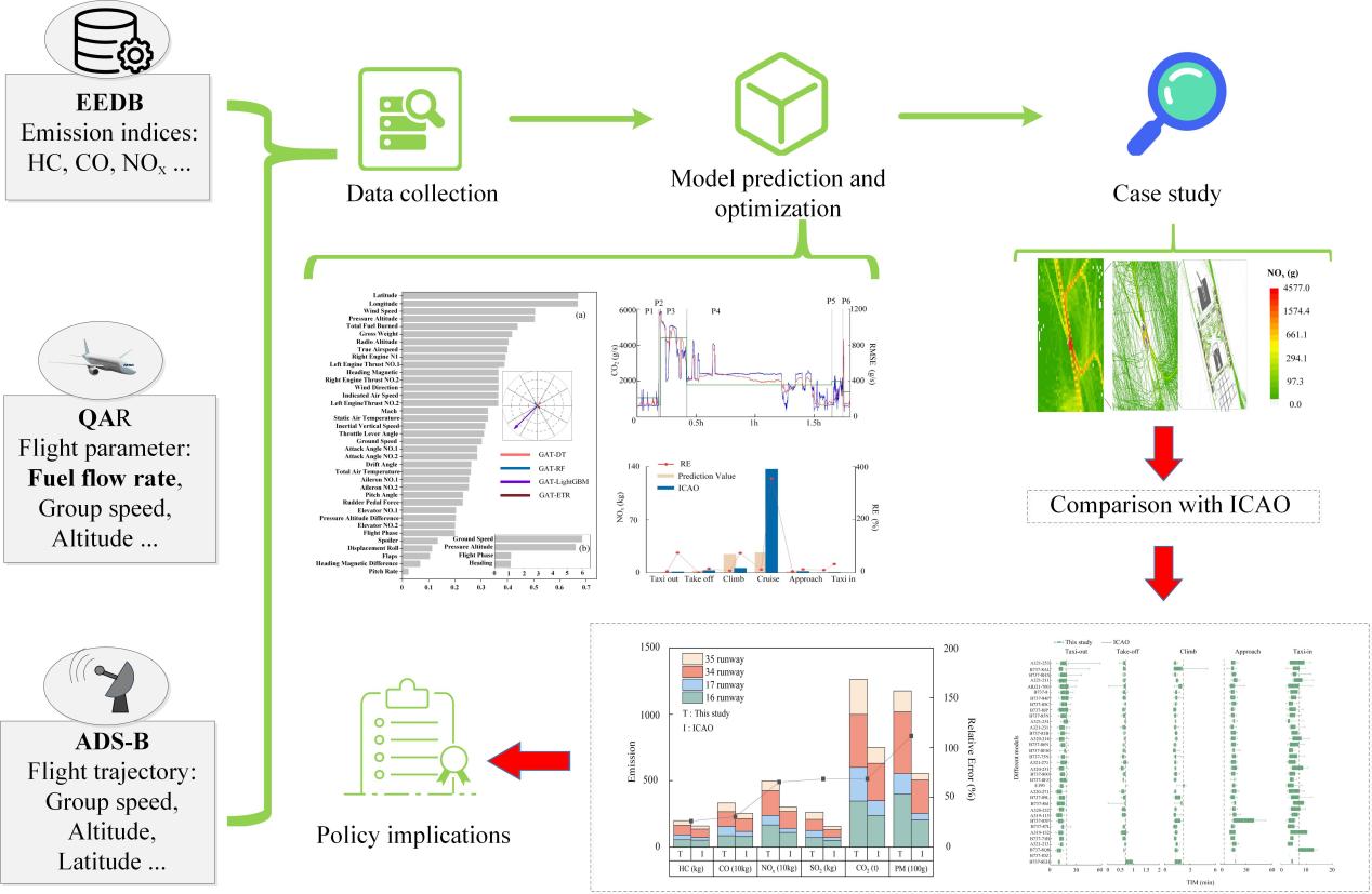 据介绍,污染排放的精准与动态定量,是机场大气环境治理的关键问题,对推进民航减污降碳具有重要意义。然而,由于飞机特有的四维运行特点和空地通信技术的局限性,导致污染排放的时空分布难以实时精准捕捉。为了解决这一问题,本研究提出了一种基于四维飞行航迹的飞机排放动态表征模型,通过揭示“航迹-排放”关联性,实现机场全域排放的动态表征。相较于传统排放估计模型,该方法综合考虑了复杂工况下飞行航迹与飞机性能参数之间的非线性关联,显著提升了排放量化精度,为实现飞机污染排放实时监控提供了关键基础。针对青岛胶东机场的实例研究表明,通过构建机场高分辨率的污染物排放清单,揭示了航班运行过程中不可忽视的减排潜力。本研究不仅为全面了解机场排放时空特征及其对大气环境和人体健康的影响提供了重要技术支持,还为构建环境友好型航班运行体系提供了方法和实践指导。