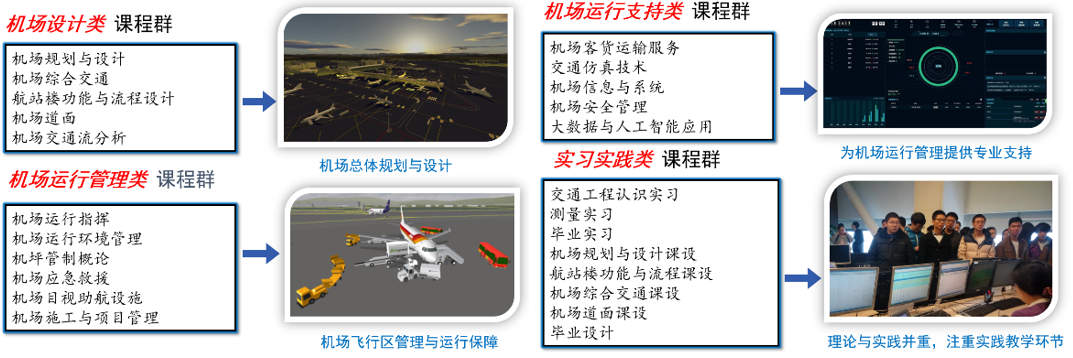 运筹与优化、智能算法、机场规划与设计、航站楼功能与流程设计、机场交通流分析、机场道面(I)(双语)、机场运行指挥(I)、交通仿真技术、机场运行环境管理、机场目视助航设施(I)、机坪管制概论(双语)。