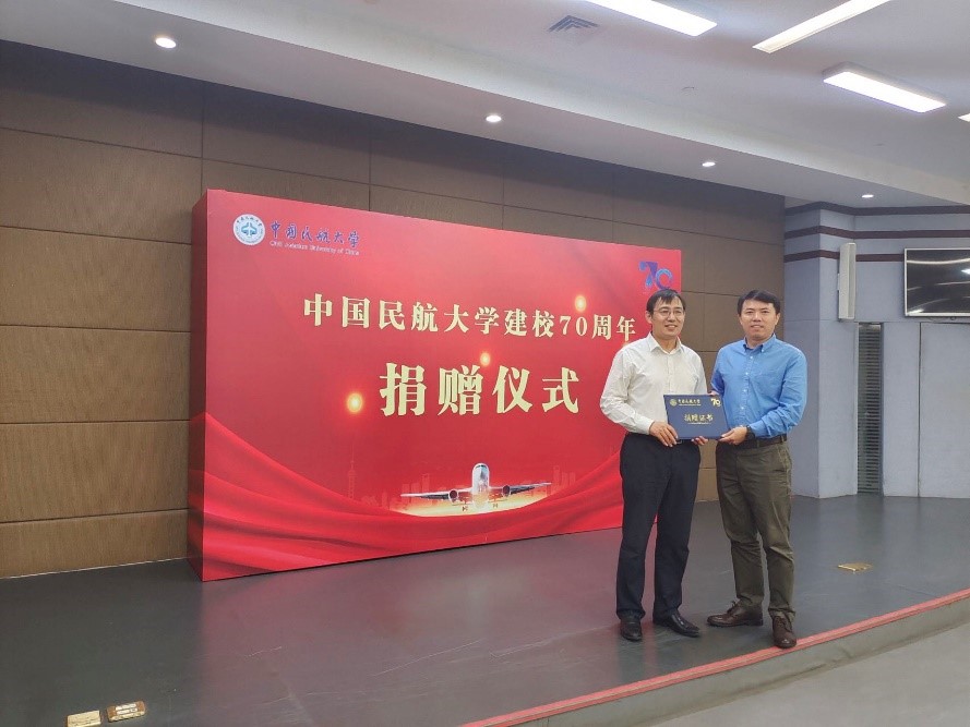 民航大学70周年庆捐赠仪式校办主任牛国庆(左)与兰德隆总经理罗焕(右)合影