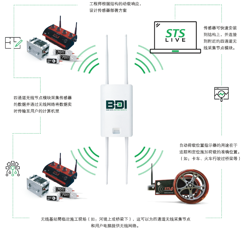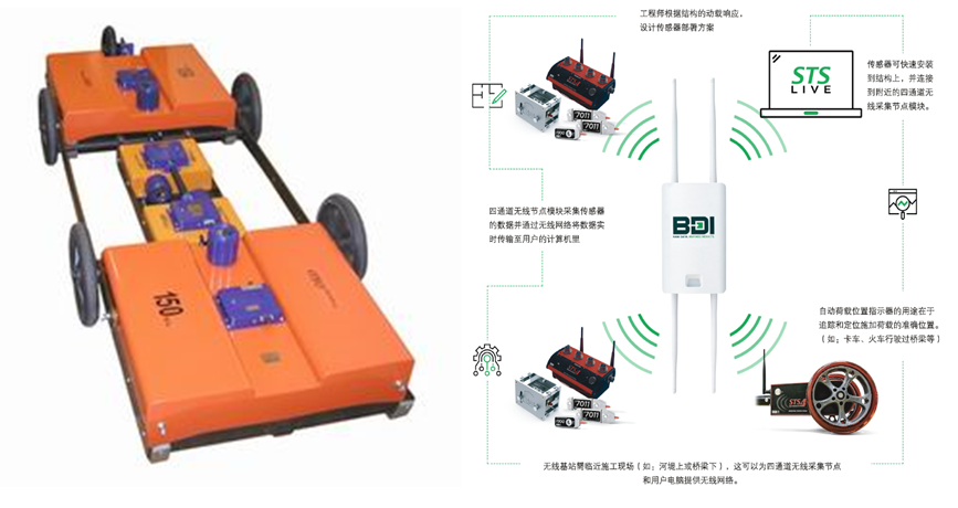 该系统使用了1台独立的基站,以及多达16台4通道的STS- WiFi“节点”,这些“节点”放置在结构上靠近传感器的地方。该系统支持包括LVDT、荷重计、弦式电位计、加速度计、和箔式应变计。采用无线通讯的方式,WinSTS软件界面友好,简单易用,用于控制STS- WiFi系统,另外还能监测信号强度和电能的消耗