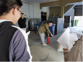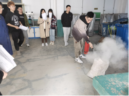 火灾发生时,根据火势如需报警立即就近用电话或手机报告消防中心(电话119);报警时,讲明发生火灾或爆炸的地点、燃烧物质的种类和数量,火势情况,报警人姓名、电话等详细情况,待对方放下电话后再挂机;明确具体人员分工。图1为灭火演练现场照片。