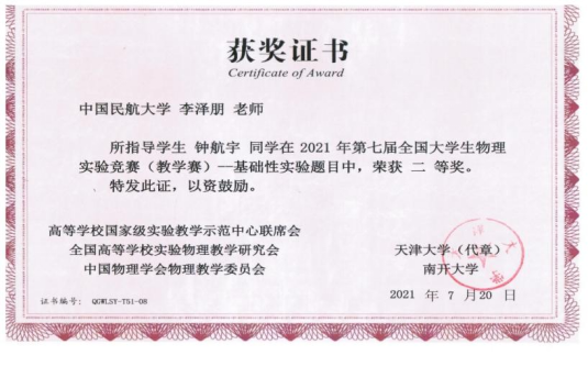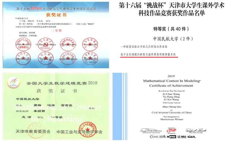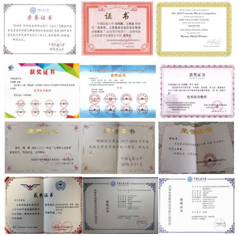 1)中国民航大学教学成果二等奖,《以需求为导向构建复合型人才培养体系向行业输送适应面宽拓展力强理学人才》(2019)。