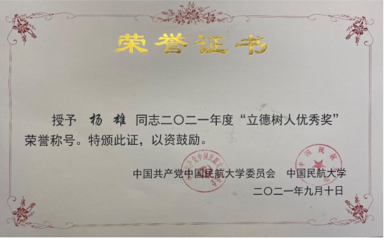 中国民航大学首届(2021)立德树人奖获得者杨雄教授