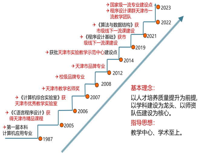计算机科学与技术专业始建于1987年,发展历程如图1。经过三十多年的发展专业逐步构建起了具有民航行业特色的计算机专业课程体系,成为了国家级一流本科专业建设点。