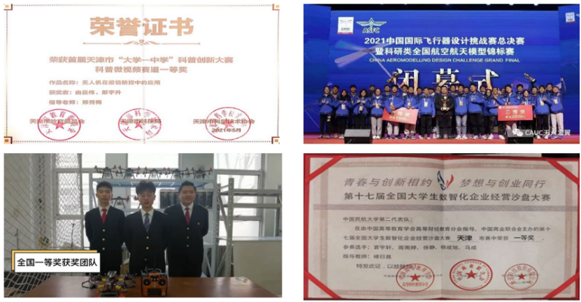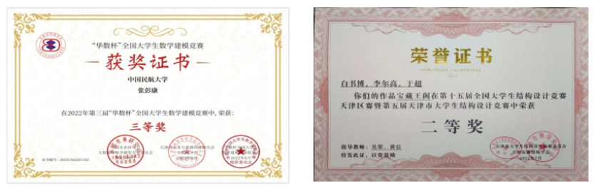 2021年全国大学生电子设计竞赛全国一等奖、2021中国国际飞行器设计挑战赛国家级一等奖、第十七届全国大学生数智化企业模拟经营大赛国家级二等奖、第十六届全国大学生交通运输科技大赛一等奖、2021年全国大学生电子设计竞赛全国二等奖、2021年全国大学生电子设计竞赛天津市一等奖、2021年全国大学生英语作文大赛大学英语组天津市一等奖、天津市文艺展演天津市二等奖、天津市第四届心理委员技能竞赛三等奖、2021年“中国银行杯”全国高校冰壶联赛国家级第九名、天津市首届高校冰壶联赛女子组第三名、第23届中国大学生篮球二级联赛总决赛第七名、天津市大学生篮球比赛本科院校男子组第一名。2022年“华数杯”全国大学生数学建模竞赛三等奖、2022年“挑战杯”中国银行天津市大学生创业设计竞赛铜奖、第十五届全国大学生结构设计竞赛天津区赛暨第五届天津市大学生结构设计竞赛二等奖。