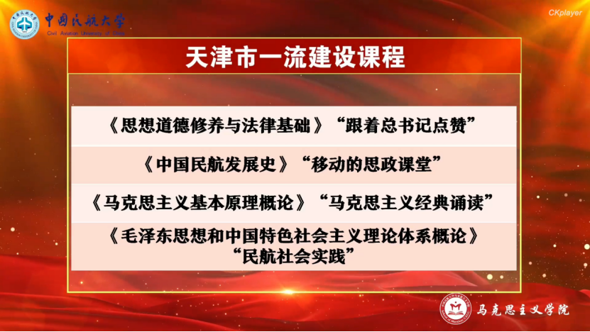 学院强化政策支撑机制,出台青年教师培养计划、教学科研团队培育计划、“手拉手”导师传帮带等举措。近年来多位教师荣获天津市及全国民航系统思想政治理论课各类比赛一等奖5项、二等奖9项、三等奖15项;4门课程获批天津市一流建设课程,《中国民航史教程》被评为天津市课程思政优秀教材。