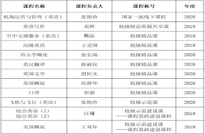 英语专业将教学质量作为核心竞争力,持续进行“双一流”建设,拥有国家级一流建设课程1门、校级精品建设课程7门、校级精品资源共享建设课程1门、校级示范建设课程1门。目前专业已获批省部级优秀教学团队1个(民航英语教学团队),校级教学型创新团队1个(民航外语教学型创新团队)。