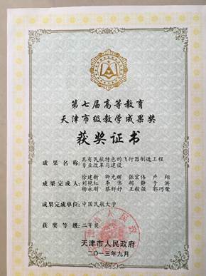 飞行器制造工程专业持续推进专业改革和建设,先后完成了教育部综合改革试点建设、天津市品牌专业和卓越工程师试点建设、天津市一流本科专业建设等多项省部级以上教改项目;拥有10余门优质课程,包括天津市一流本科建设课程,天津市级精品课程,天津市创新创业教育示范课程,校级精品资源共享课程,校级精品课程,以及天津市虚拟仿真实验建设课程等;获天津市教学成果奖,民航局教学成果奖,校级教学成果奖,优秀教学奖,全国徐芝纶力学优秀教师奖,教学基本功竞赛全国一等奖等奖励20余项。出版教材7本,翻译出版飞机结构强度及维修类专著2部。