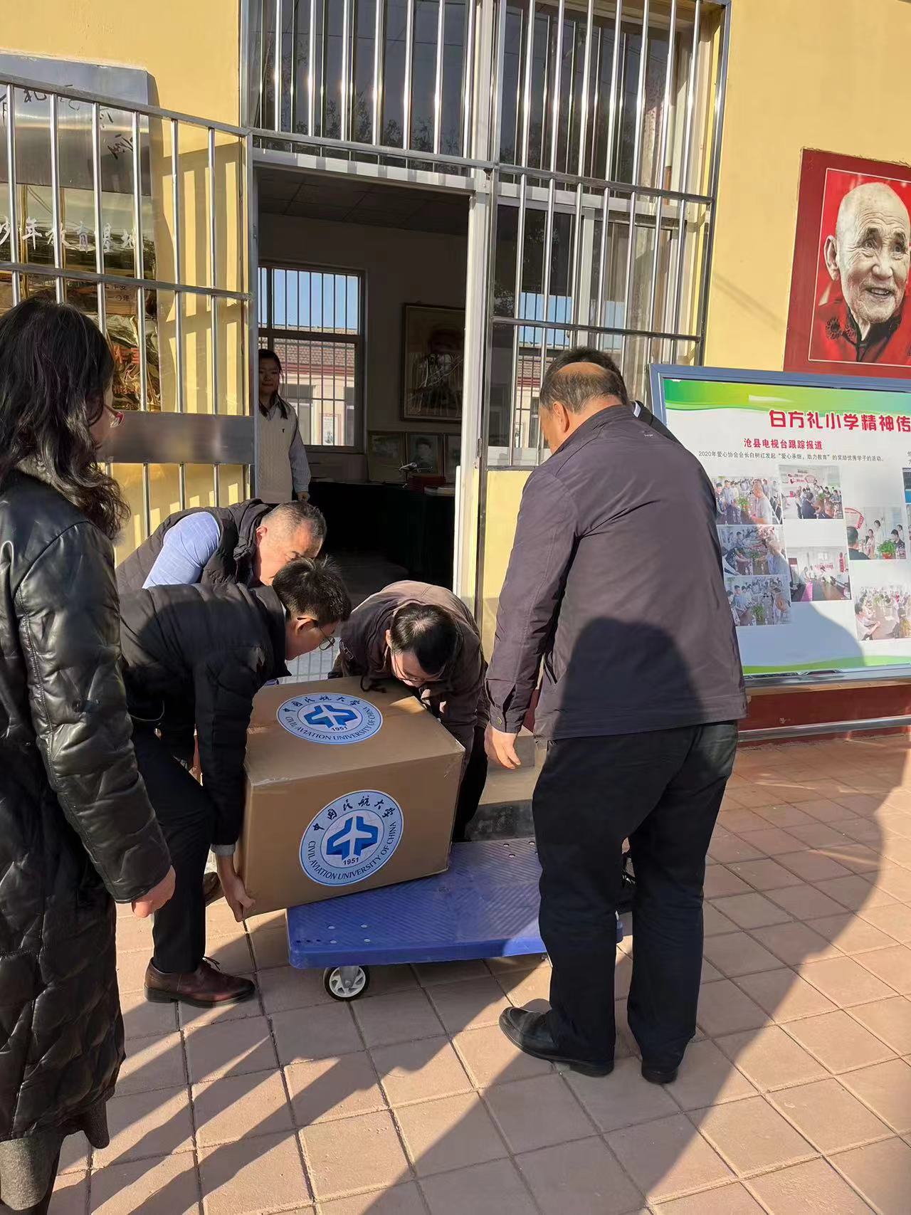 首先,教务处党支部前往以“感动中国”支教老人白方礼命名的乡村小学。白方礼老人在天津蹬了十多年三轮车,省吃俭用,将攒下钱全部捐给天津与河北的贫困孩子,支持孩子读书上学。白方礼小学河北的一所普通农村小学,两排一楼砖房,外墙漆成黄色,红色屋瓦平整,墙上有标语“黑发不知勤学早,白首方悔读书迟。”教务处党支部党员为白方礼小学的学生整理捐赠《走进民航》等书籍,参观小学中白方礼老人纪念展览室并学习白方礼老人无私奉献教育事业的感人事迹。