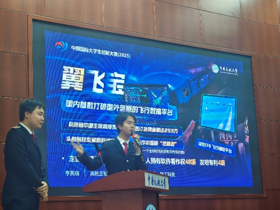 主赛道中实现我校国赛金奖“零的突破”的“翼飞宝”项目负责人李英瑞同学深情回顾了团队受少年飞行梦想启迪,从模拟飞行中捕捉创新灵感,历经九年坚守,最终成功研发出国内首款打破国外垄断的飞行数据平台,构建起贯通“仿真训练-通航航校-民航企业”的全链条EFB生态体系的创业历程。