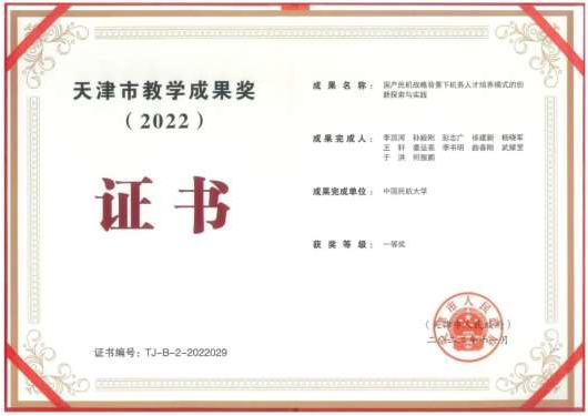 项目成果获批2022年天津市教学成果一等奖。航空工程学院以新工科建设项目“面向未来民航技术发展的机务专业改造升级路径探索与实践”为牵引,在国产民机战略实施和民航强国建设的背景下,积极开展机务人才培养模式的创新研究和实践,有效解决了传统机务专业的改造升级问题。