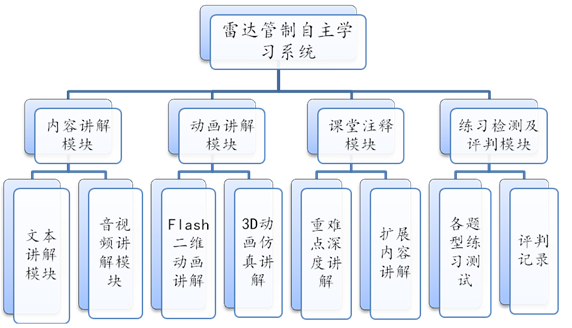 雷达管制自主学习系统构成包括内容讲解模块、动画讲解模块、课堂注释模块、练习检测及评判模块等如图1、图2、图3所示。