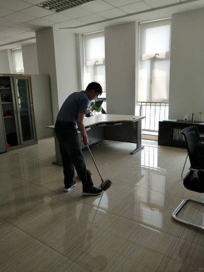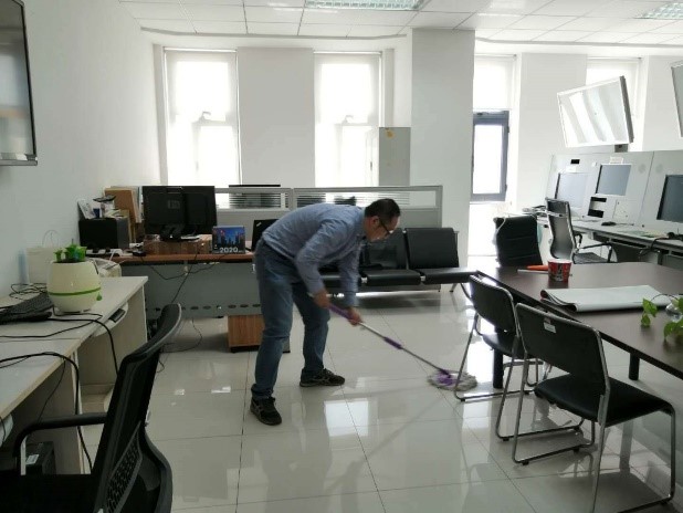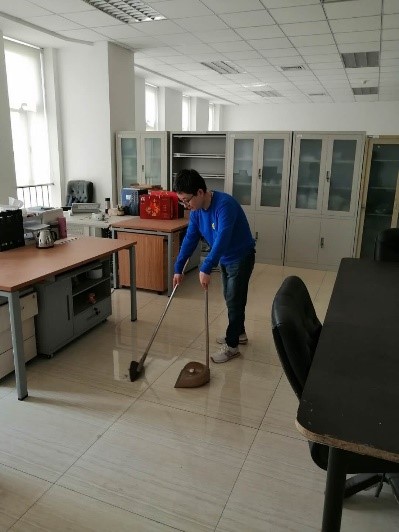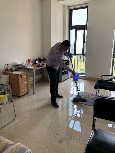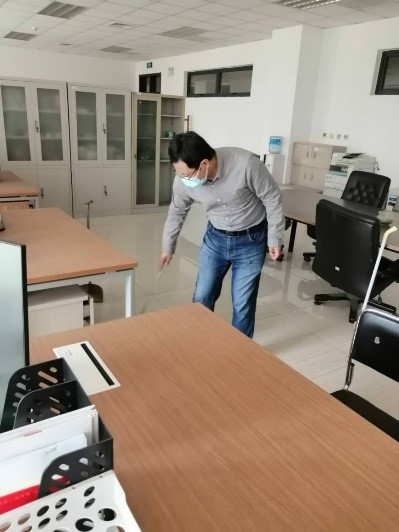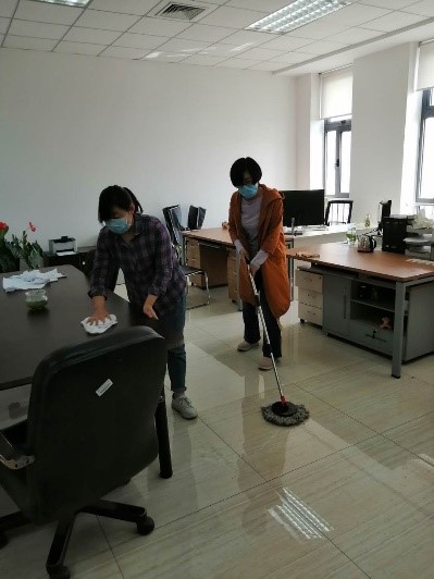 各位老师均按时到校,对办公楼、实验室、楼道走廊等区域及办公用品、门把手、桌椅等进行全面清洗打扫和卫生消毒,在每个办公室配备84消毒液、洗手液,用于擦拭、喷洒消毒。各位老师情绪饱满,已经为五一后的复学做好了充足的准备。