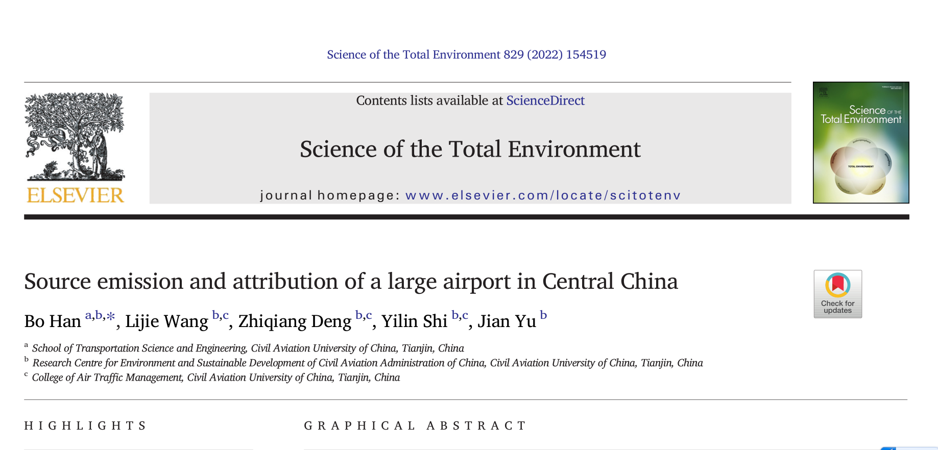 近日,《Science of The Total Environment》期刊发表了一项来自我校科研团队的最新成果,题目为“Source emission and attribution of a large airport in Central China”,期刊为JCR Q1分区,影响因子10.753。该论文的作者包括韩博、王立婕、邓志强、石依琳、于剑,其中王立婕、邓志强、石依琳三位主要作者为我院2019、2020级在读研究生,第一/通讯作者韩博副教授为学生指导教师。