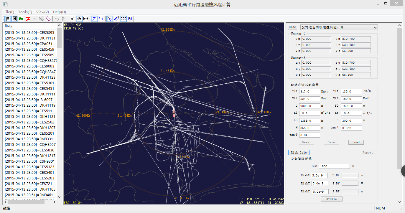 基于VC平台开发近距平行跑道风险评估和安全间隔计算工具软件系统,通过读入ADS-B数据,可自动进行位置误差分析,利用所建立的近距平行跑道运行模式下的碰撞风险评估模型,可以又快又准地实时获得在不同进近模式下两家航空器的碰撞风险,并计算在固定碰撞风险条件时,航空器应该保证的安全间隔。为解决日益严重的航班延误问题,提高航空公司运行效率,促进我国民航机场的快速发展提供决策参考和技术工具支持。系统软件界面如下: